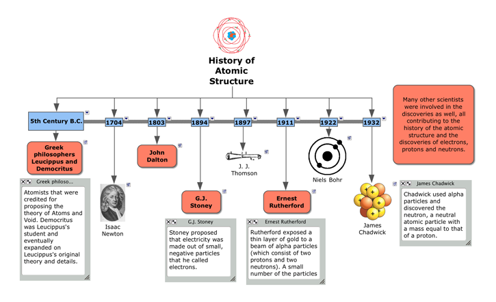 History of the Atom. The history of the atom has thought to significantly begin with Dalton's finding of multiple proportions. Thomson later discovered the electron, and Rutherford inferred a nucleus to the atom. Niels Bohr proposed that electrons were in clearly defined quantized orbits. It wasn't until 1932, when the neutron with neutral charge and mass similar to the proton, was discovered by Chadwick.
