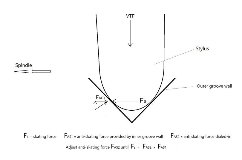 Audiophiles are often faced with adjusting the anti-skating setting of their turntable to prevent an inward tendency of the stylus which could otherwise bias towards the inner record groove and cause uneven channel balance or distortion.