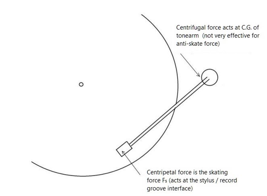 The skating force the turntable stylus experiences when playing a vinyl LP is called a Centripetal force (centripetal meaning “center seeking”) because it is travelling around a curved path at constant speed.  Another force accompanies the Centripetal force called Centrifugal force (“outward fleeing”) which is equal and opposite to the Centripetal force.  Since the Centrifugal force is equal and opposite, one would think it should suffice as an anti skating force and keep the cartridge stylus balanced and centered in the groove.   However, although the Centrifugal force is equal and opposite to the Centripetal force, it acts thru the center-of-gravity of the entire tonearm - which if you recall - is located at the gimbal pivot.  This is where the tonearm balances.  When tracking force is added (such as 2 grams) this will move the CG slightly forward of the gimbal pivot, but it is still well out-of-position to provide substantial anti-skating force.