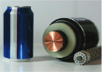 A standard conductor from an overhead line is shown on the right.  To its left is a solid dielectric underground cable.  The aluminum can is shown for comparison purposes.