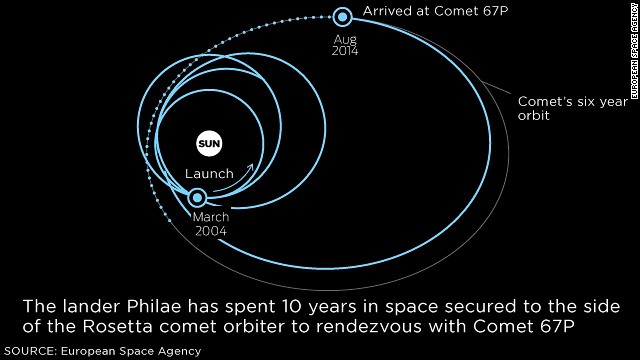 The comet’s rather eccentric orbit around the sun, at a period of 6-1/2 years, will reach its next perihelion (closest point to the sun) in August of 2015 and expel hundreds of kilograms of material every second (the characteristic tail of a comet).  It is thought that this activity along with the rising temperature will cause damage to Philae and even Rosetta.  The orbiter will remain alongside the comet for over a year and the lander predicted to be stuck to the comet indefinitely even after its systems have shut down.