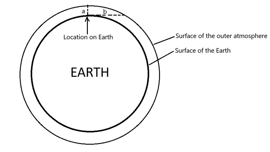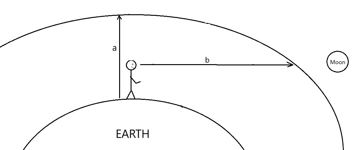 It is easily observed that when you are on Earth and looking straight up towards the sky, the layer or thickness of atmosphere, a, is much less than the layer or thickness of atmosphere when looking towards the horizon, b.  This is elementary geometry.  The medium of air is thicker at b and thinner at a.  And what do we know about a transparent medium that is thicker in the middle and thinner at the edges ?   The answer is a convex lens, and a convex lens is a  lens which magnifies.  This easily explains the larger appearance of the Moon at the horizon.  It is magnified by the atmosphere which acts as a convex lens, just like a magnifying glass.  That’s the explanation in one paragraph, and I barely had to try.  If it is explained in one paragraph, what is rest of the scientific community thinking ?  Why can’t they agree on this one explanation ?