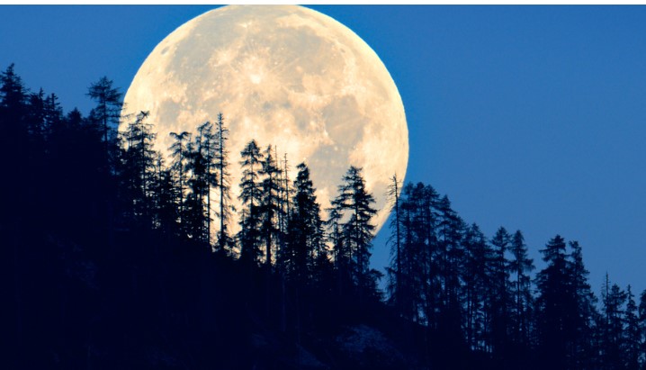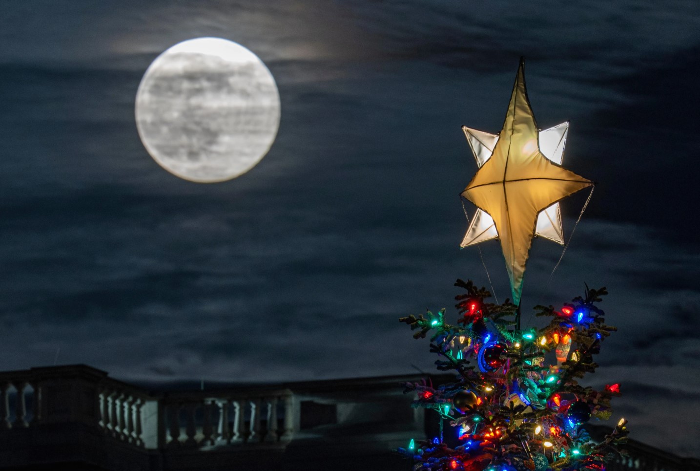 Super Moon of December 4, 2025 rises behind the U.S. Capitol Christmas Tree in Washington DC.  It seems to beckon Man’s return to the Moon in the coming future.  {AP}
