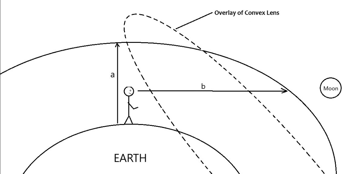 Going back to the explanation of atmospheric lensing, if it were not for the relative position of the observer, the explanation of a convex lens magnifying the Moon would not hold true.  But there is relativity in this particular circumstance the same that relativity is in all circumstances.  This is where the new scientists must have missed the point.  They only saw the uniform layer of atmosphere around the Earth and could not reason it as a convex lens.  But the relative position of the observer will cause a convex lens (overlayed in the diagram below) and therefore magnify the Moon just like a magnifying glass.
